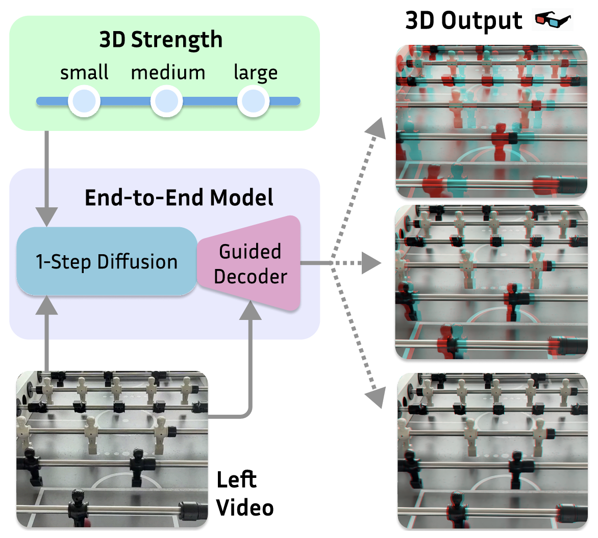 We turn 2D videos into 3D stereo videos using a controllable end-to-end model with a novel guided Decoder. No warping, high sharpness, minimal binocular rivalry, and adjustable 3D strength.