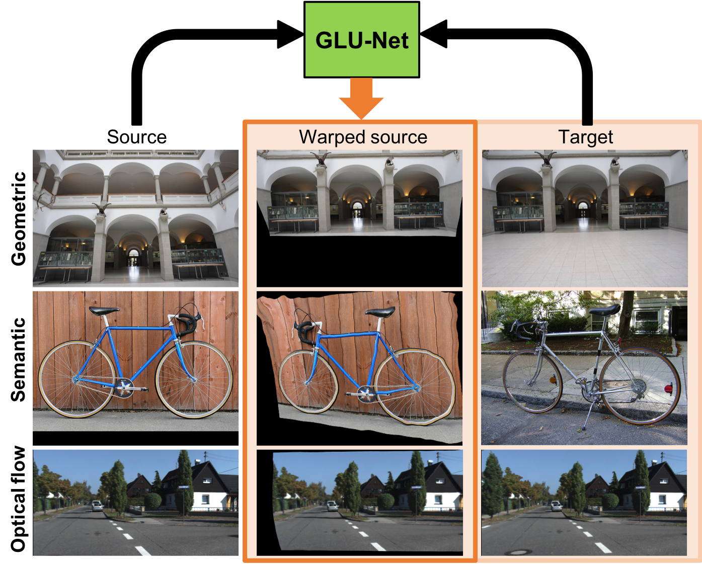 We propose GLU-Net, a unified architecture to estimate dense correspondences between any image pair, i.e. different